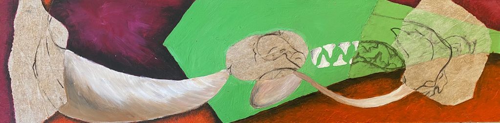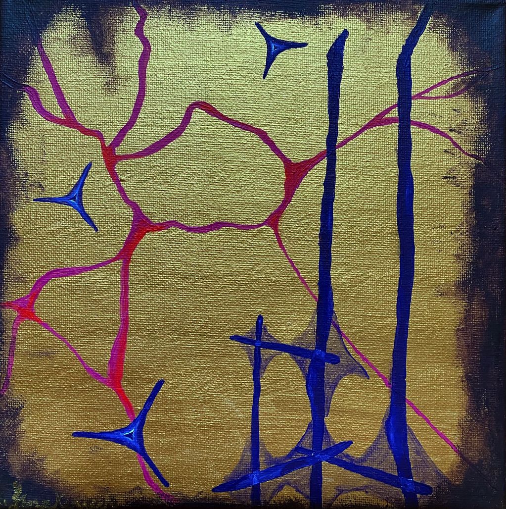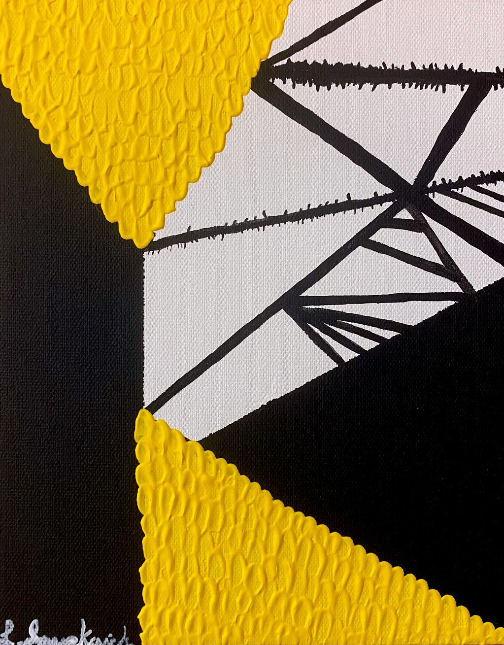 Acrylic, stencil paper, and colored cardstock on wood panel
